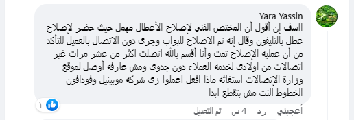 قالت إحدى عملاء المصرية للاتصالات We عبر صفحة الشركة الرسمية على موقع "فيسبوك"،: "أف إن أقول أن المختص الفنى لإصلاح الأعطال مهمل حيث حضر لإصلاح عطل بالتليفون وقال إنه تم الاصلاح للبواب وجرى دون الاتصال بالعميل للتأكد من أن عمليه الإصلاح تمت".