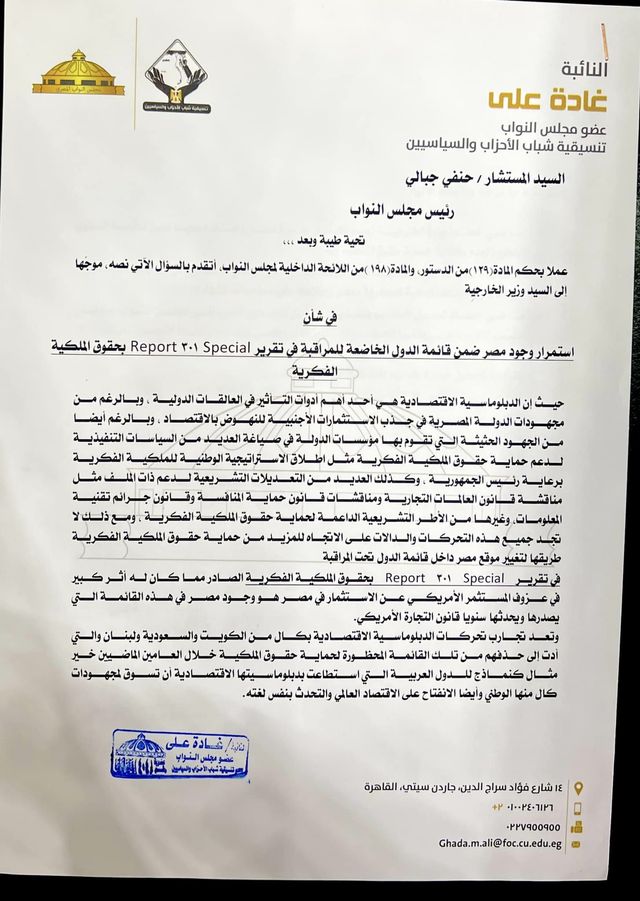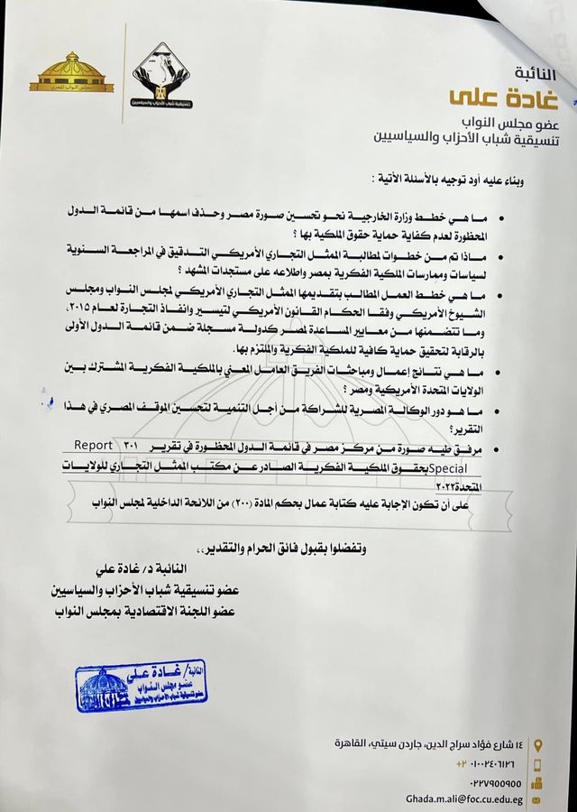 وأشارت غادة علي إلى أنه في ظل استمرار مصر ضمن القائمة المحظورة لحماية الملكية الفكرية، فقد توجهت بالأسئلة التالية لوزير الخارجية: