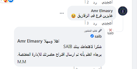 طالب أحد عملاء بنك سايب saib بوجود فرع في الزقازيق التابعة لمحافظة الشرقية.