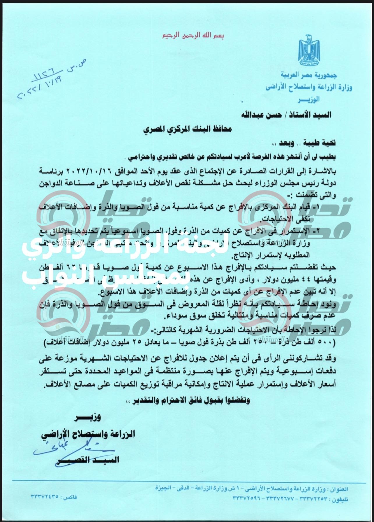 وتضمن خطاب وزير الزراعة لمحافظ البنك المركزى الاحتياجات الضرورية الشهرية بشأن الأزمة وهى 500ألف طن ذرة، و250 ألف طن بذرة فول صويا، وما يعادل 25مليون دولار إضافات أعلاف .
