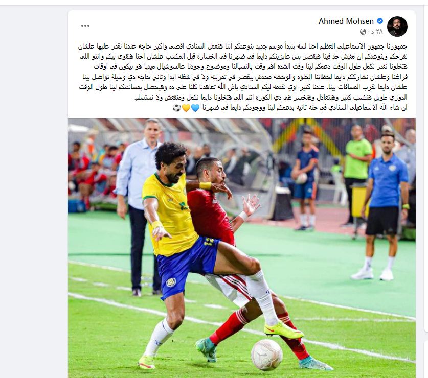 وكتب أحمد محسن عبر صفحته الرسمية على«فيس بوك»: «جمهورنا جمهور الاسماعيلي العظيم احنا لسه بنبدأ موسم جديد بنوعدكم اننا هنعمل السنادي اقصى واكبر حاجه عندنا نقدر عليها علشان نفرحكم وبنوعدكم ان مفيش حد فينا هيقصر بس عايزينكم دايما في ضهرنا في الخساره قبل المكسب علشان احنا هنقوى بيكم وانتو اللي هتخلونا نقدرنكمل».