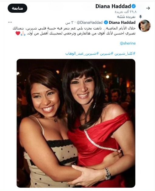 ونشرت ديانا حداد صورة تجمعها بـ شيرين عبد الوهاب عبر حسابها الرسمي بموقع التدوينات القصيرة تويتر، وعلقت: خلال الأيام الماضية تابعت بحزن يلي عم بتمر فيه حبيبة قلبي شيرين، بتمنالك تصيري أحسن لأنك أقوى من هالعارض وترجعي لمحبينك أفضل من أول.