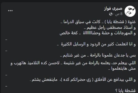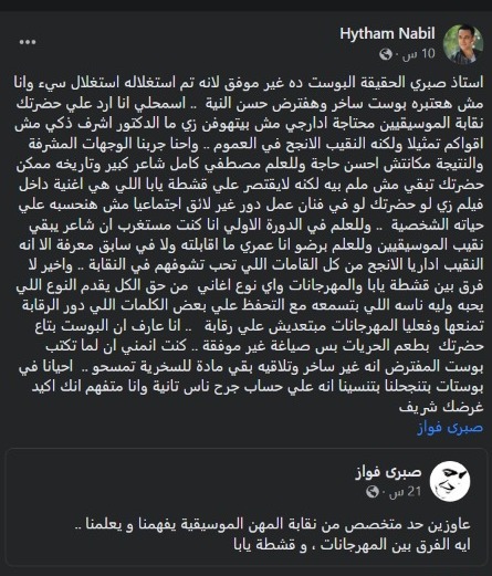 وبعدها رد الفان صبري فواز على منشور هيثم نبيل، عبر حسابه الرسمي بموقع التواصل الإجتماعي فيسبوك، قائلًا: غنوة “قشطة يابا”.. كانت في سياق الدراما وأستاذ مصطفى راجل عظيم، والمهرجانات وحشة وحشاااااااة وكخة خالص.