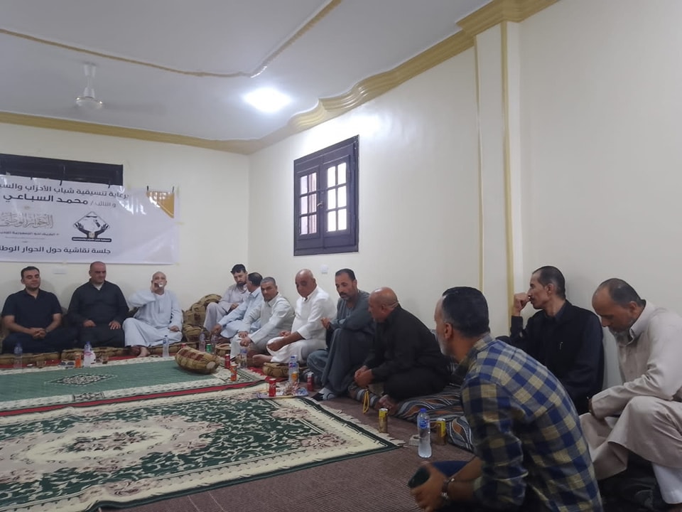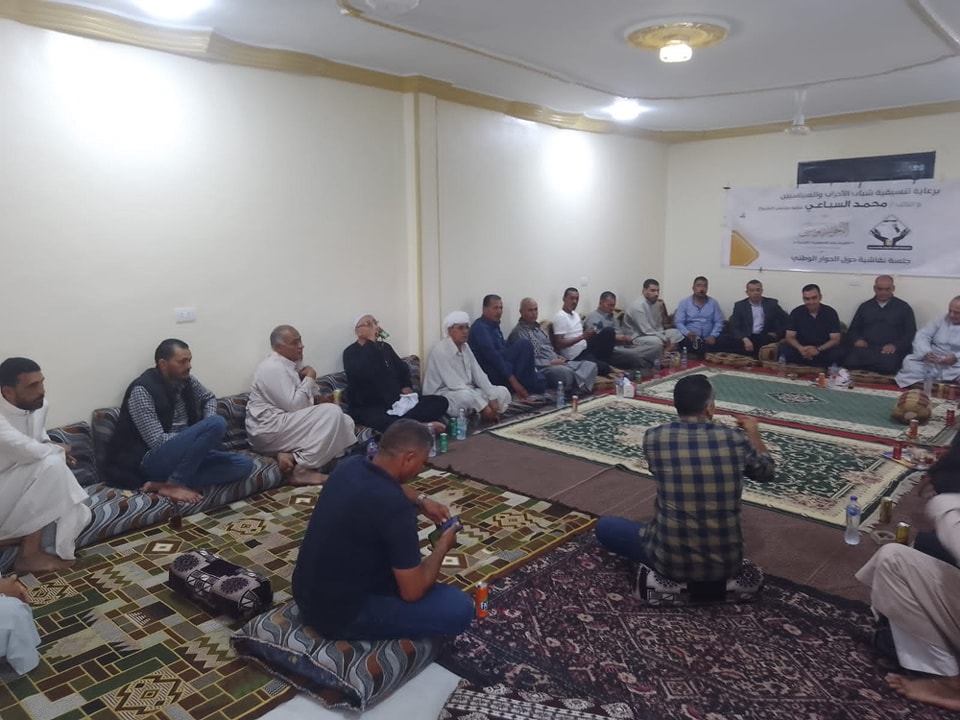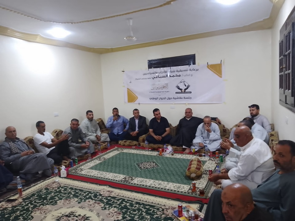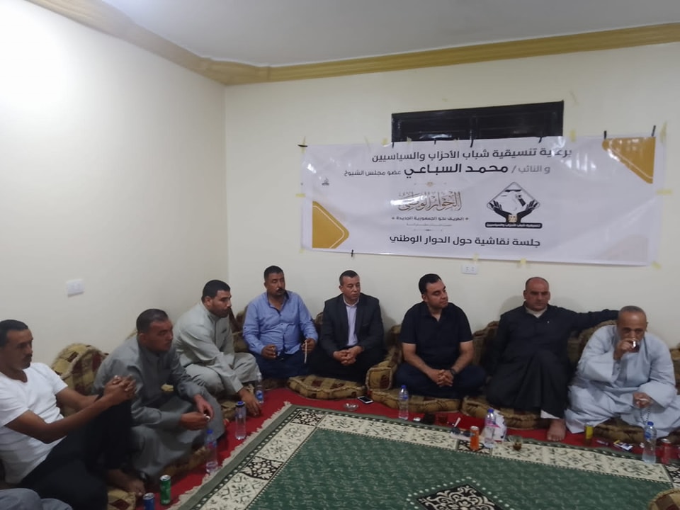 حيث عقد النائب محمد السباعي عضو مجلس الشيوخ عن تنسيقية شباب الأحزاب والسياسيين جلسة نقاشية اليوم الجمعة حول الحوار الوطني بحضور أهالي منطقة بحر البقر.