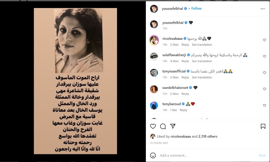 أعلن يوسف الخال زوج الفنانة نيكول سابا عن وفاة خالته سوزان بيرقدار، وذلك عبر حسابه الرسمي بموقع تبادل الصور والفيديوهات الشهير انستجرام.