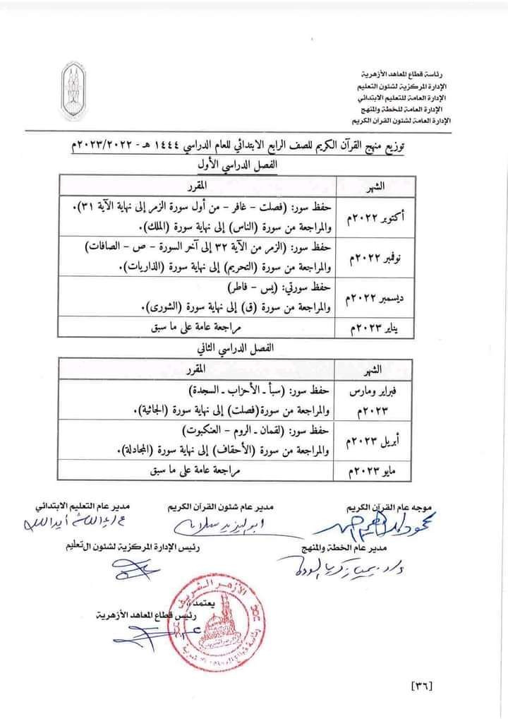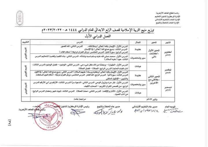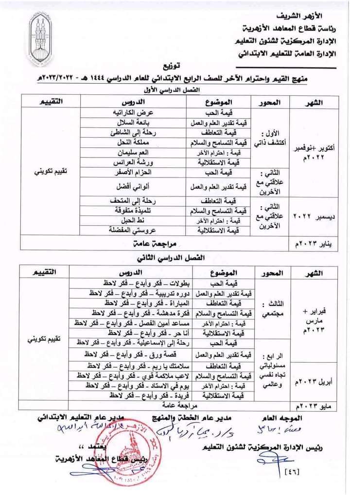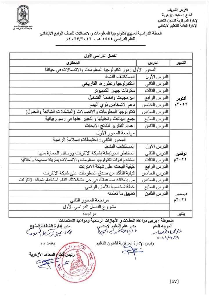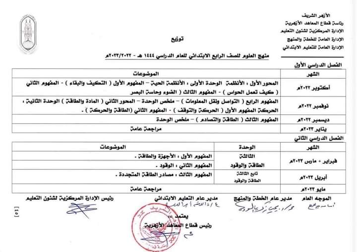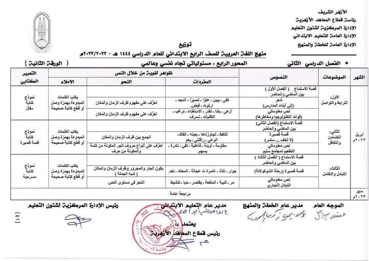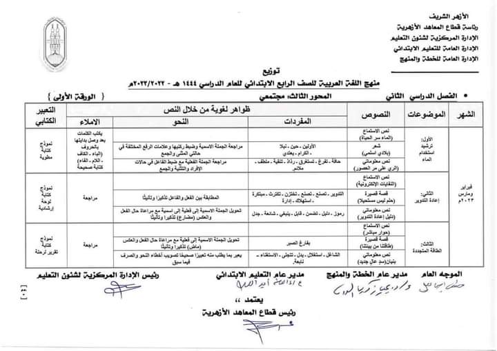 وجاء توزيع مناهج الأزهر الجديدة 2023 للصف الرابع الإبتدائي كما هو موضح بالصور التالية :