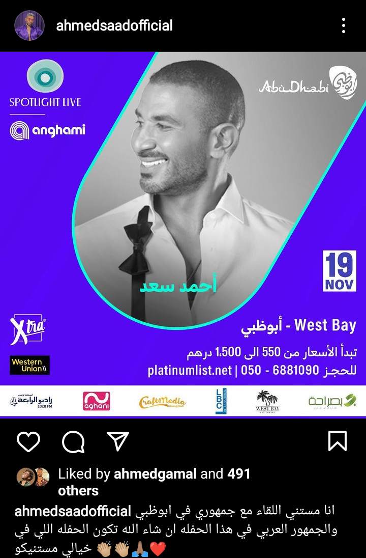 ونشر سعد بوستر الحفل عبر حسابه بموقع تبادل الصور والفيديوهات انستجرام وعلق:أنا مستني اللقاء مع جمهوري في أبو ظبي والجمهور العربي في هذا الحفلة وأن شاء الله تكون الحفلة اللي في خيالي.. مستنيكوا.