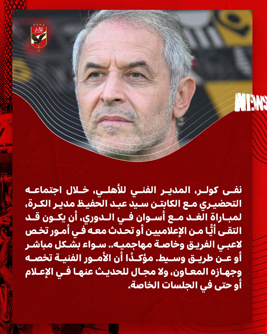وقال السويسري مارسيل كولر في الاجتماع التحضيري الخاص بمباراة أسوان إلى سيد عبد الحفيظ مدير الكرة بالنادي، أن يكون قد التقيا أيا من الإعلاميين أو تحدث معه في أي أمور تخص لاعبي الفريق وخاصة مهاجميه، سواء بشكل مباشر أو عن طريق وسيط، مؤكدًا أن الأمور تخصه وتخص الجهاز المعاون، ولا مجال للحديث عنها في الإعلام أو حتى في الجلسات الخاصة .