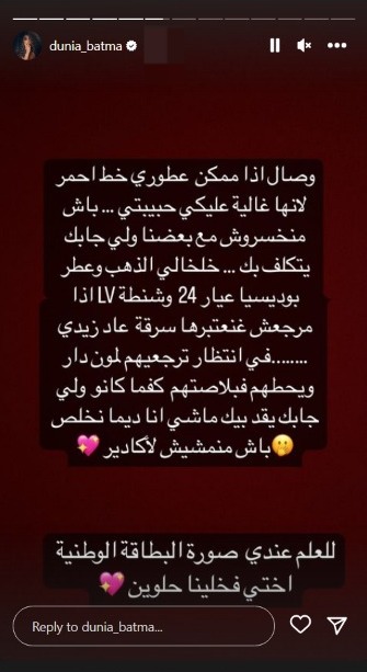 وتابعت دنيا بطمة: “خلخالي الذهب، وعطر بوديسيا عيار 24.. وشنطة LV، وإذا لم ترجع سأعتبرها سرقة.. وللعلم عندي صورة البطاقة الوطنية أختي فـ خلينا حلوين".
