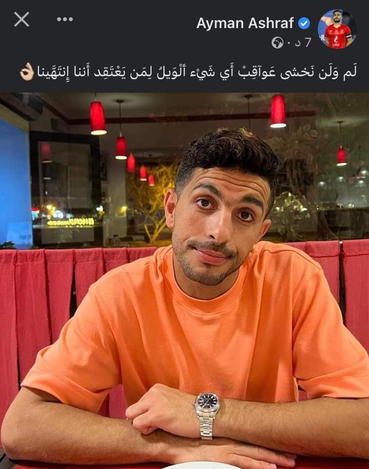 أثار أيمن أشرف لاعب الفريق الأول لكرة القدم بالنادي الأهلي، الجدل برسالة غامضة نشرها فور انتهاء فريقه من مواجهة اليوم أمام فريق أسوان في الجولة الثانية من بطولة الدوري المصري الممتاز.