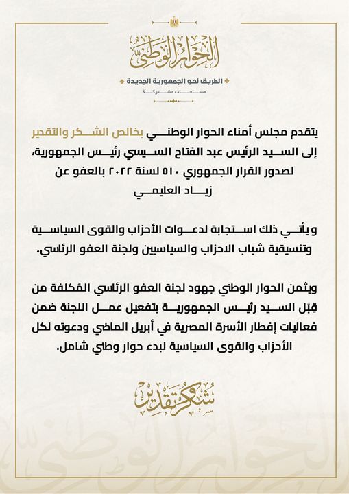 قدم مجلس أمناء الحوار الوطني، خالص الشكر والتقدير إلى الرئيس عبد الفتاح السيسي رئيس الجمهورية، لصدور القرار الجمهوري ٥١٠ لسنة ٢٠٢٢ بالعفو عن زياد العليمي.