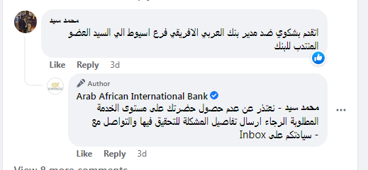 وقال عميل البنك العربى الافريقى الدولى عبر صفحة المصرف الرسمية على موقع "فيسبوك"،: "اتقدم بشكوى ضد مدير البنك العربى الافريقى فرع أسيوط إلى السيد العضو المنتدب".