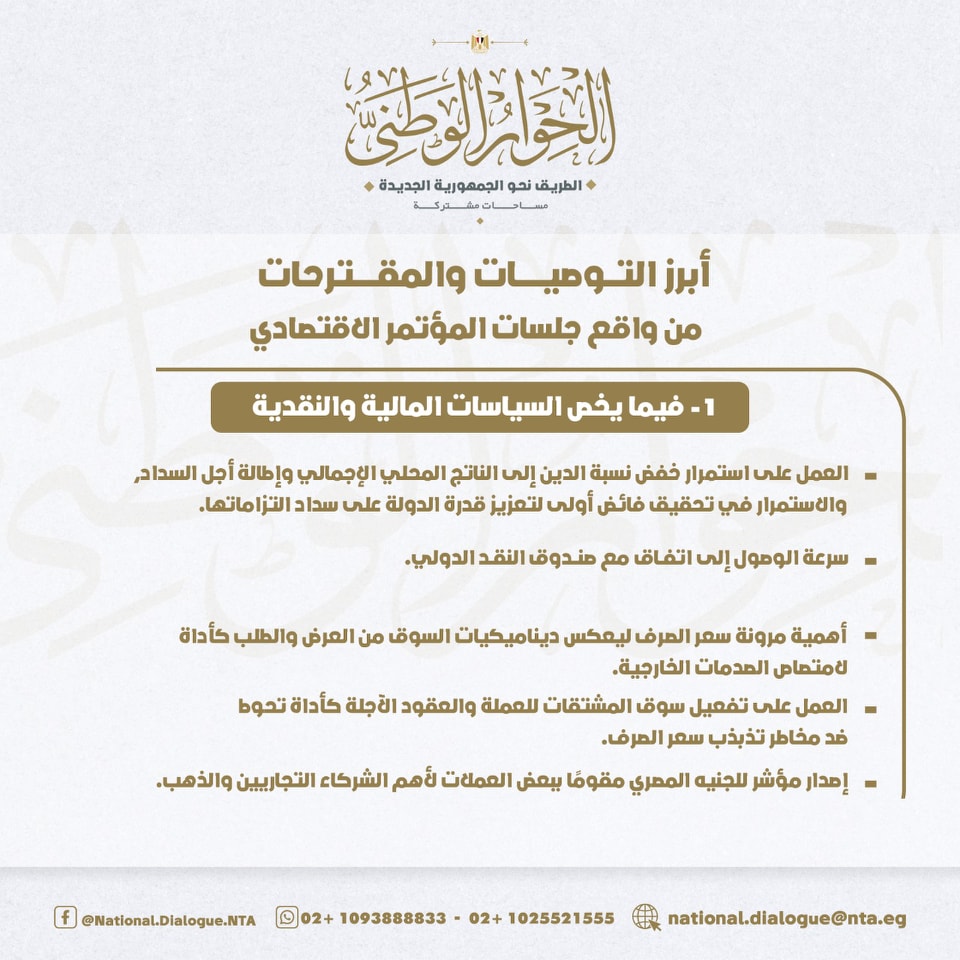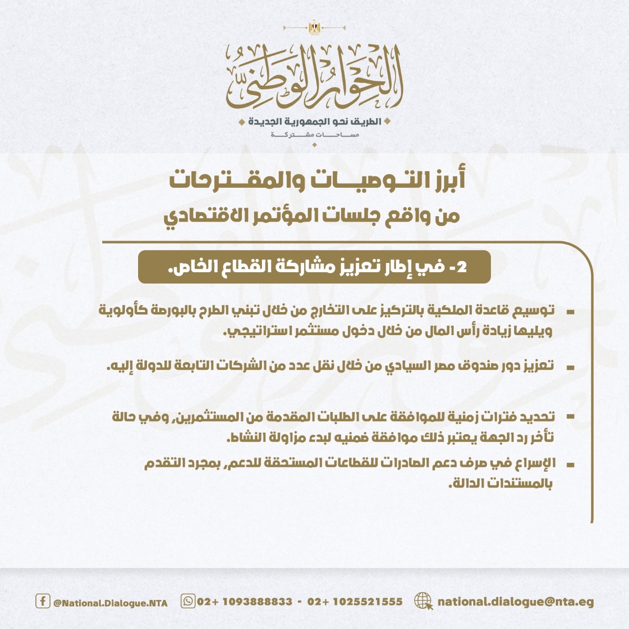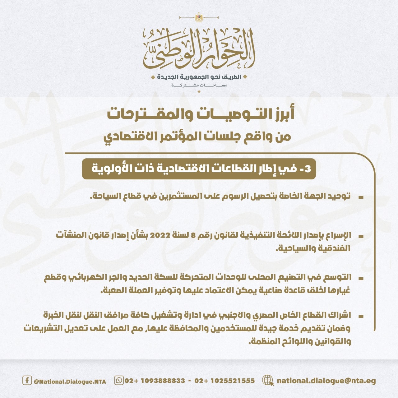 نشرت الصفحة الرسمية للحوار الوطني، أبرز التوصيات والمقترحات الخاصة بالمؤتمر الاقتصادي - مصر ٢٠٢٢، والتي ألقاها ضياء رشوان نقيب الصحفيين والمنسق العام للحوار الوطني في الجلسة الختامية للمؤتمر برعاية وتشريف الرئيس عبدالفتاح السيسي رئيس الجمهورية.