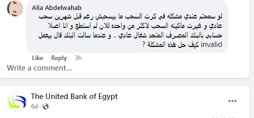 قالت أحدى عملاء بنك المصرف المتحد في تعليق عبر تعليق على صفحة المصرف الرسمية على موقع "فيسبوك"، :لو سمحتم عندي مشكلة في كارت السحب ما بيسحبش رغم قبل شهرين سحب عادي وغيرت ماكينة السحب لأكثر من واحدة للآن لم استطع وأنا اصلا حسابي بالبنك المصرف المتحد شغال عادي.. وعندما سالت البنك قال بيعمل invalid كيف حل هذه المشكلة؟".