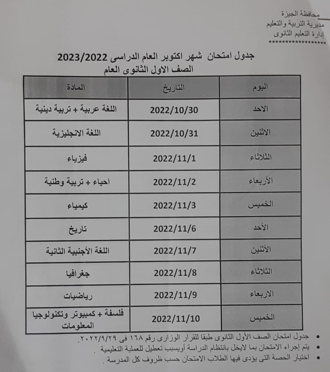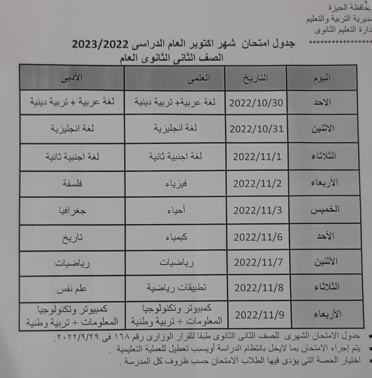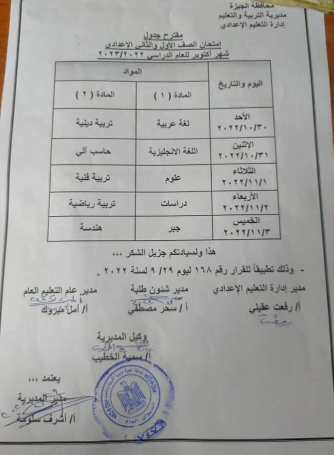 ننشر مقترح جدول امتحانات أكتوبر بالجيزة للصف الأول والثانى الإعدادى والأول والثانى الثانوى بمحافظة الجيزة وفى أنتظار أعتماده من مدير مديرية التربية والتعليم بالجيزة أشرف سلومة أستعدادا لبدء أول أختبار من الاختبارات الثلاثة فى الفصل الدراسي الأول لطلاب سنوات النقل .