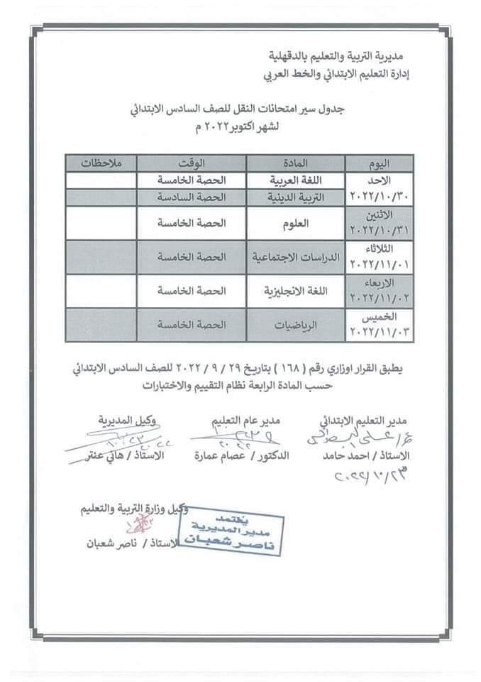 جداول امتحان شهر أكتوبر بمحافظة الدقهلية لصفوف النقل