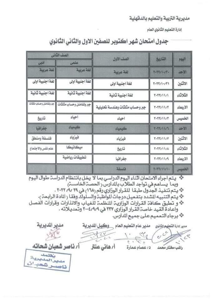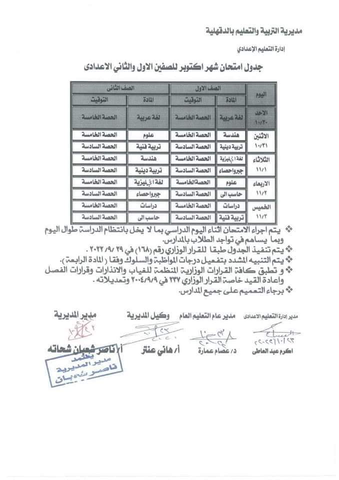 وجاءت جداول امتحان شهر أكتوبر بمحافظة الدقهلية لصفوف النقل كما هو موضح بالصور