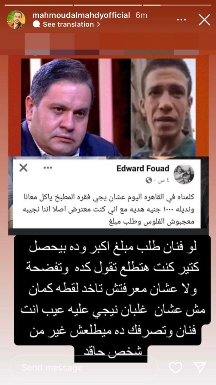ونشر محمود المهدي صورة تصريح إدوارد عبر خاصية ستوري بانستجرام، وعلق: لو فنان طلب مبلغ أكبر وده بيحصل كتير كنت هتطلع تقول كده وتفضحة؟ ولا عشان معرفتش تاخد لقطة كمان مش عشان غلبان نيجي عليه.