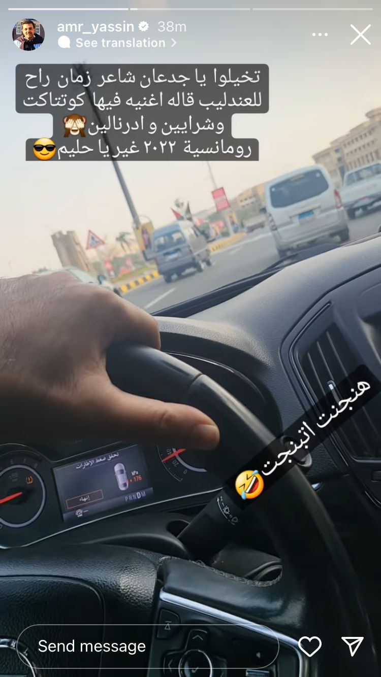 ونشر عمرو محمود ياسين مقطع فيديو له في السيارة وهو يستمع لأغنية “ادرينالين” وعلق: تخيلوا يا جدعان شاعر زمان راح للعندليب قاله أغنية فيها كونتاكت وشرايين وادينالين.. رومانسية 2022 غيريا حليم.. هنجت اتبنجت 😂.