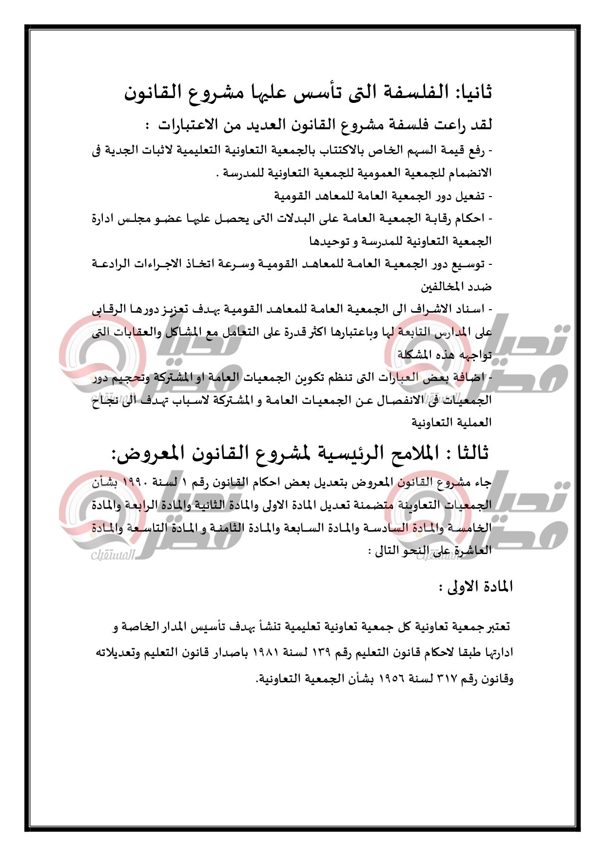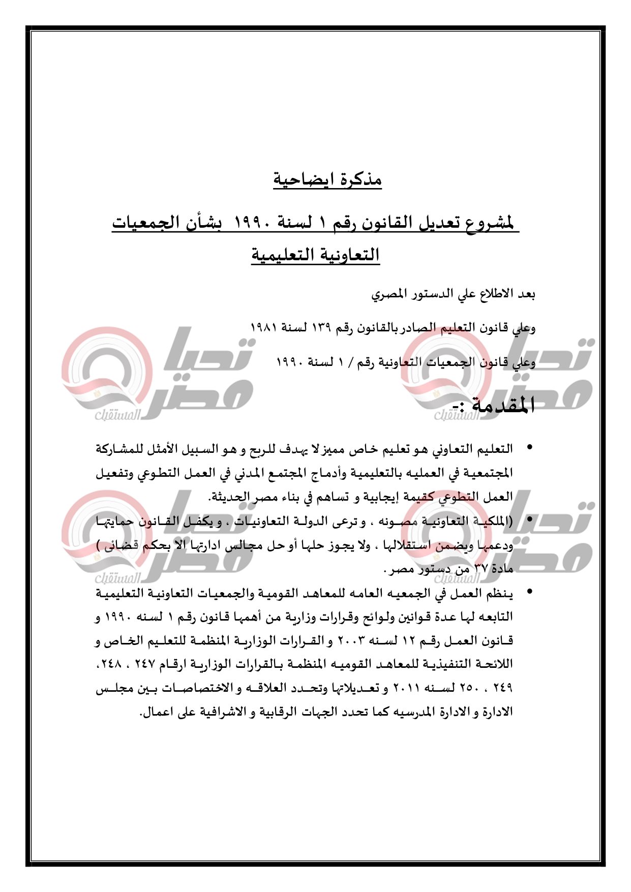 مشروع القانون تضمن بأن التعليم التعاوني هو تعليم خاص مميز لا يهدف للربح وهو السبيل الأمثل للمشاركة المجتمعية في العمليه بالتعليمية وأدماج المجتمع المدني في العمل التطوعي وتفعيل العمل التطوعي كقيمة إيجابية و تساهم في بناء مصر الحديثة ، وأيضا الملكية التعاونيـة مصـونه ، وترعى الدولة التعاونيات ، و يكفـل القـانون حمايتها ودعمها ويضمن استقلالها ، ولا يجوز حلها أو حل مجالس ادارتها الا بحكم قضائي ) وذلك بحكم مادة 37 من دستور مصر.