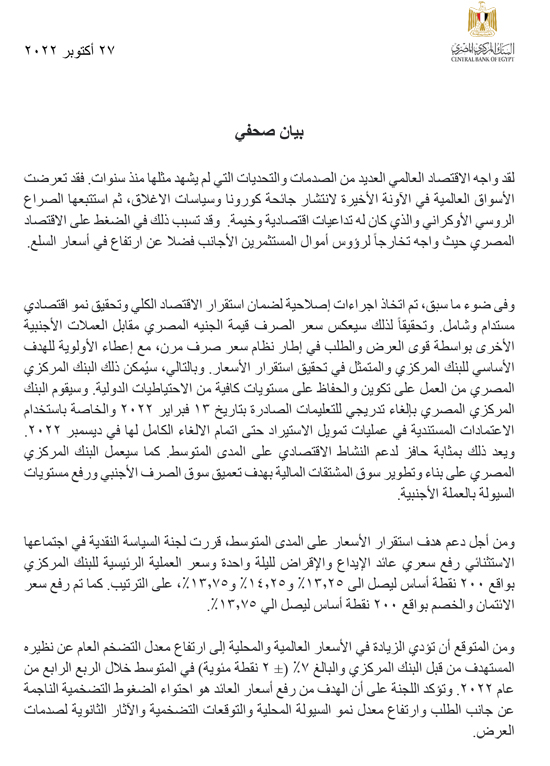 قررت لجنة السياسة النقدية في اجتماعها الاستثنائي رفع سعري عائد الإيداع والإقراض لليلة واحدة وسعر العملية الرئيسية للبنك المركزي بواقع 200 نقطة أساس ليصل الى 13.25 ٪و14.25 ٪و13.75 ،٪على الترتيب.