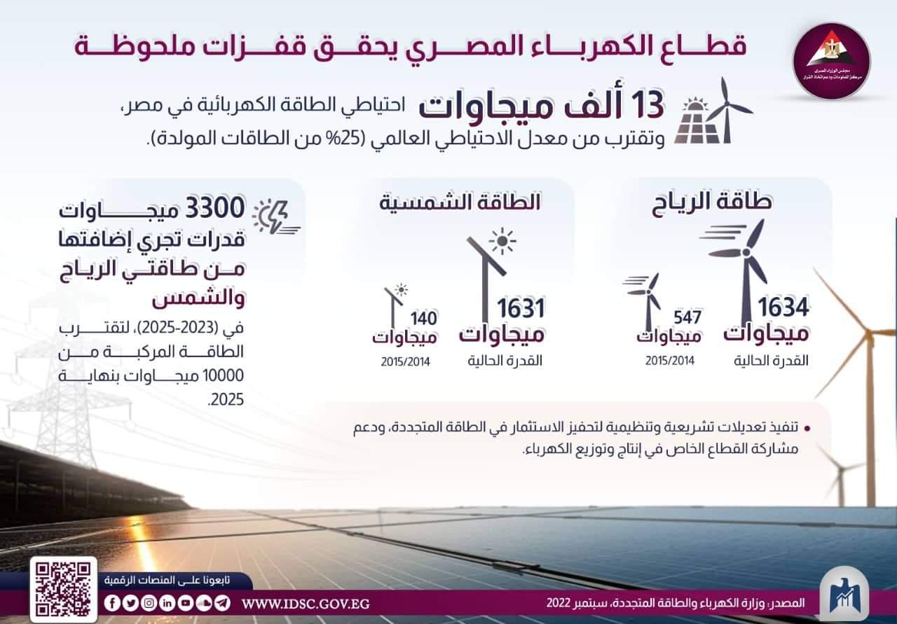 فيما بلغت القدرة الحالية للكهرباء المولدة من طاقة الرياح نحو 1634 ميجاوات، مقارنة بنحو 547 ميجاوات في 2014/2015، فيما بلغت القدرة الحالية للكهرباء المولدة من الطاقة الشمسية نحو 1631 ميجاوات، مقارنة بنحو 140 ميجاوات في 2014/2015. وتجري إضافة 3300 ميجاوات قدرات كهربائية مولدة من طاقتي الرياح والشمس في (2023-2025)، لتقترب الطاقة المركبة من 10000 ميجاوات بنهاية 2025.