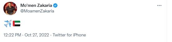 ونشر مؤمن زكريا عبر حسابه الرسمي على «تويتر» تغريدة توضح سفره وتوجهه إلى دولة الإمارات من أجل حضور السوبر بين الأهلي والزمالك في المباراة التي تجمع بين الفريقين على ملعب هزاع بن زايد في أبو ظبي .