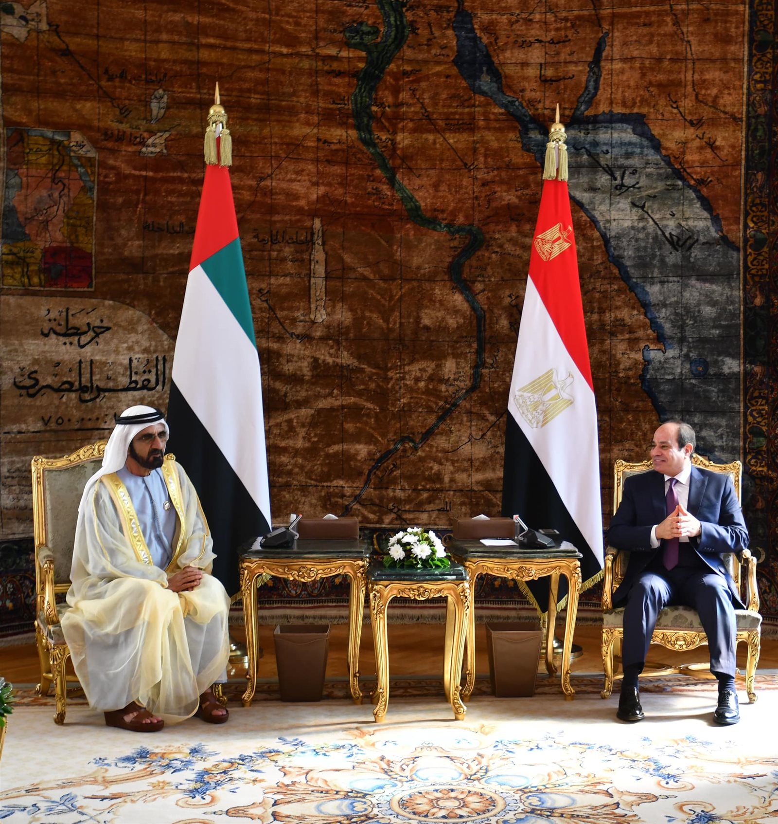 وصرح المتحدث الرسمي باسم رئاسة الجمهورية السفير بسام راضي، بأن الرئيس السيسي أعرب عن ترحيبه بالشيخ محمد بن راشد آل مكتوم في بلده الثاني مصر، والذي تتزامن زيارته مع الاحتفال بمرور 50 عاماً على إقامة علاقات دبلوماسية بين مصر ودولة الإمارات.