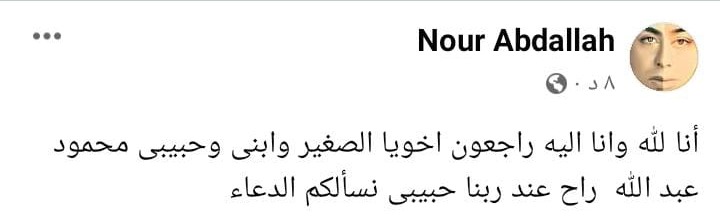 وكتبت نور عبد الله عبر حسابها بفيسبوك: “إنا لله وإنا إليه راجعون، أخويا الصغير وابني وحبيبي محمود عبد الله، راح عند ربنا حبيبي، نسألكم الدعاء”.