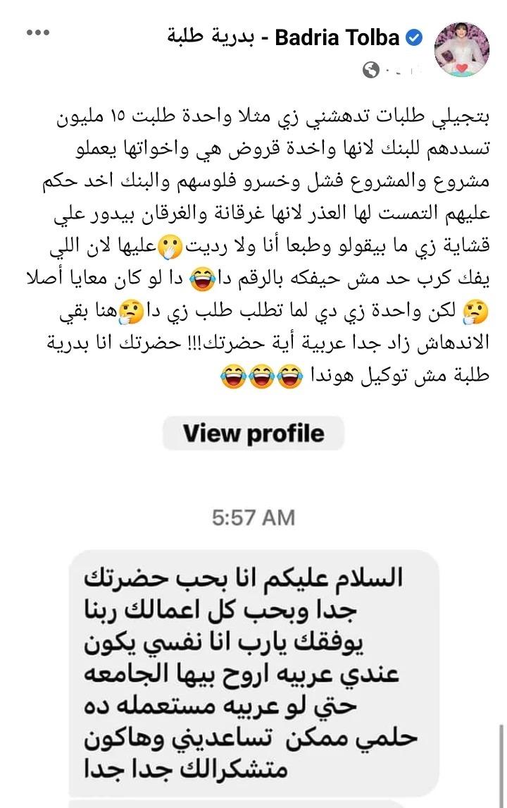 ونشرت بدرية طلبة رسالة من إحدى متابعيها، عبر حساباتها بمواقع التواصل الإجتماعي، والذي كان محتواه: أنا نفسي يكون عندي عربية أروح بيها الجامعة حتى لو عربية مُستعملة، ده حلمي ممكن تساعديني.. حلمي من زمان أروح الجامعة بعربيتي.