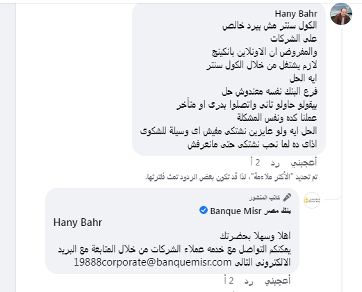 قال أحد عملاء بنك مصر عبر صفحة المصرف الرسمية على موقع "فيسبوك"،: "الكول سنتر مش بيرد خالص على الشركات والمفروض أن الاونلاين بانكينج لازم يشتغل من خلال الكول سنتر".