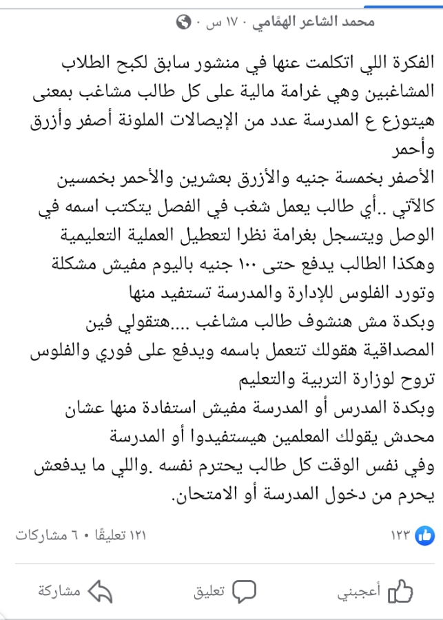 معلم يقترح غرامة من 5 إلى 100 جنية عقاباً للطالب المشاغب فى الفصل.. تفاصيل
