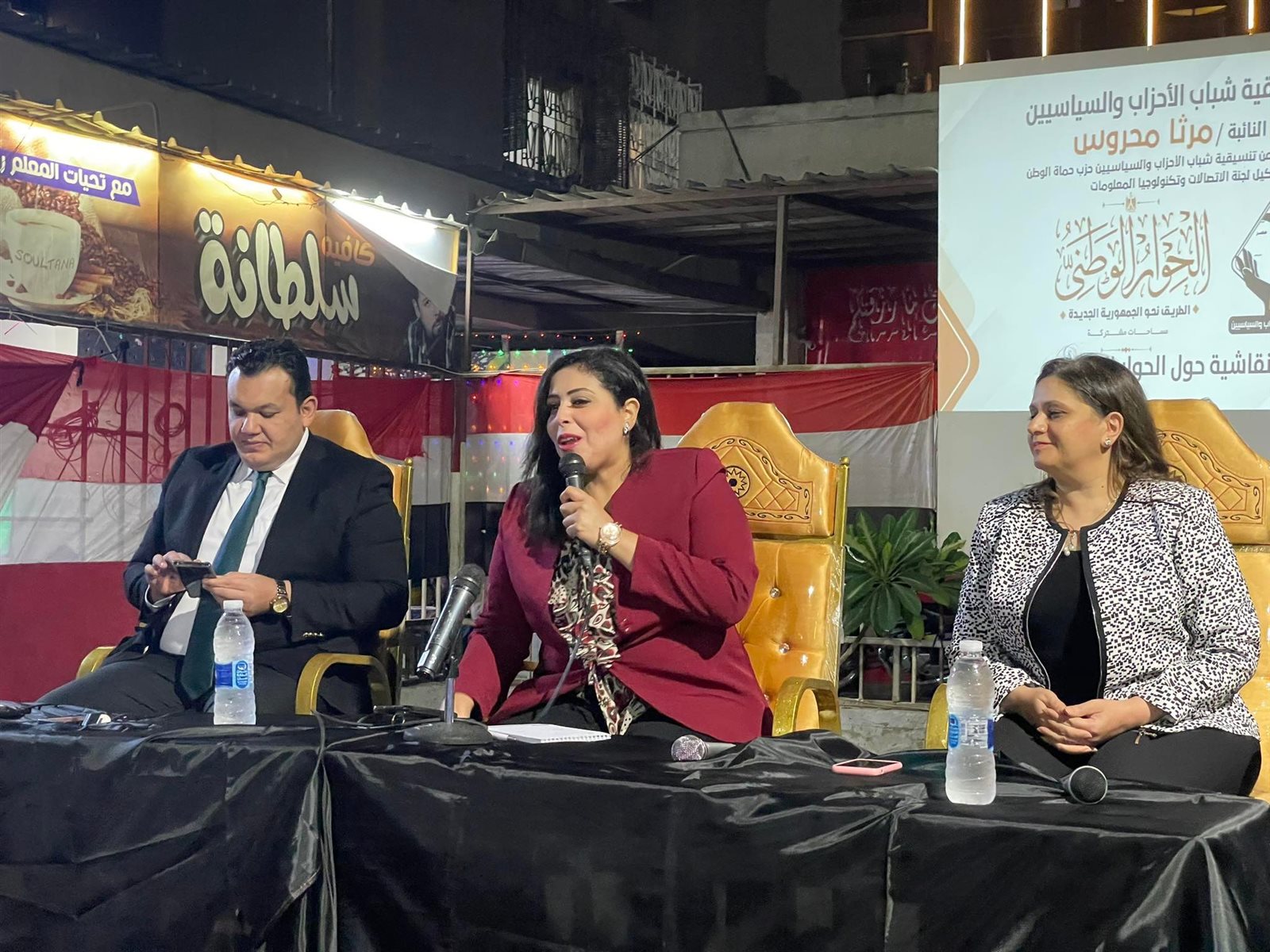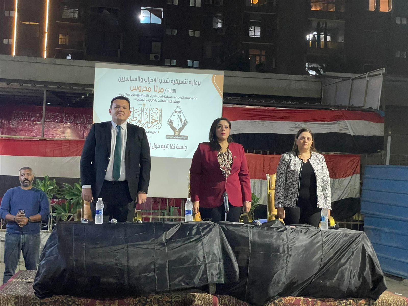 قدم النائب أحمد مقلد أمين سر لجنة الشئون العربية بمجلس النواب عن تنسيقية شباب الأحزاب والسياسيين، الشكر للنائبة مرثا محروس وكيل لجنة الاتصالات وتكنولوجيا المعلومات بمجلس النواب عن تنسيقية شباب الأحزاب والسياسيين، لحضوره جلسة نقاشية بحي الأميرية، لمعرفة أراء المواطنين وتصوراتهم حول القضايا التي سيتم طرحها خلال جلسات الحوار الوطني بكافة محافظات الجمهورية، قائلا: احنا جايين نتكلم عن مشاكلنا.