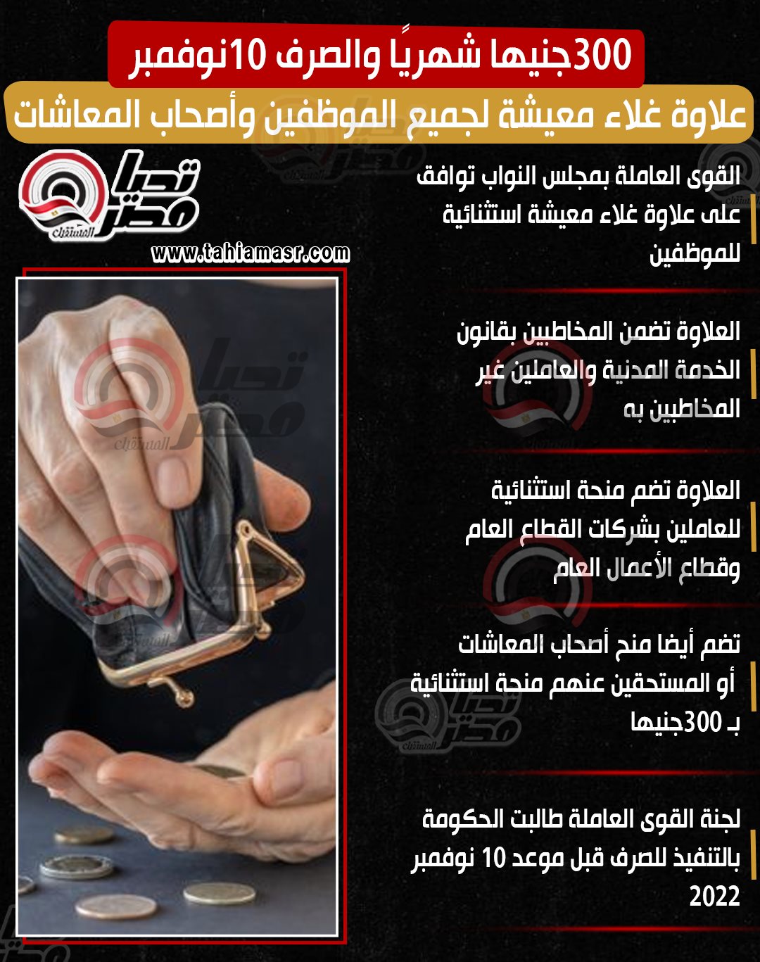 وتتضمن العلاوة المخاطبين بقانون الخدمة المدنية والعاملين غير المخاطبين به، بالإضافة إلي منحة استثنائية للعاملين بشركات القطاع العام وقطاع الأعمال العام، ومنح أصحاب المعاشات أو المستحقين عنهم منحة استثنائية بـ 300جنيها، مطالبة الحكومة بالتنفيذ للصرف قبل موعد 10 نوفمبر 2022.