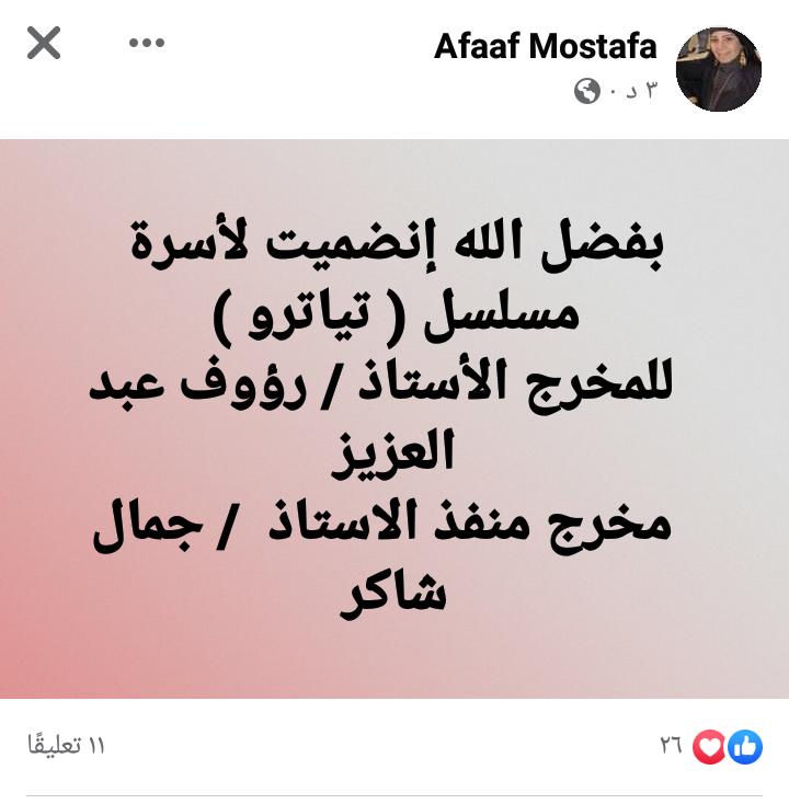 وكتبت عفاف مصطفى عبر حسابها الشخصي بموقع التواصل الاجتماعي فيسبوك: بقضل الله انضميت لاسرة مسلسل تياترو للمخرج الأستاذ رؤف عبد العزيز ومخرج منفذ الأستاذ جمال شاكر.