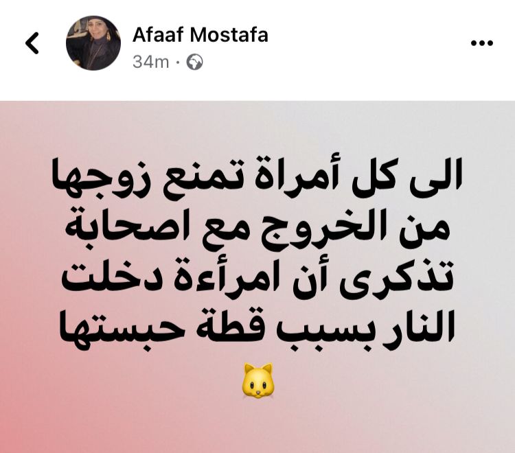 وكتبت عفاف مصطفى عبر فيسبوك: إلى كل إمرأة تمنع زوجها من الخروج مع اصحابة تذكرى أن امرأءة دخلت النار بسبب قطة حبستها.