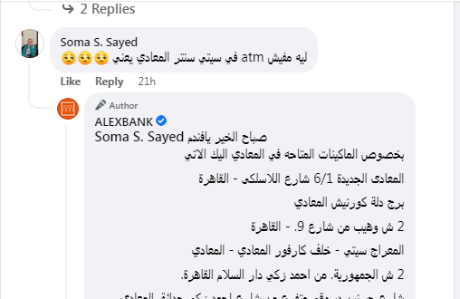 وقال إحدى عملاء بنك الاسكندرية عبر صفحة المصرف الرسمية على موقع "فيسبوك"،: "ليه مفيش atm في سيتي سنتر المعادي يعني".