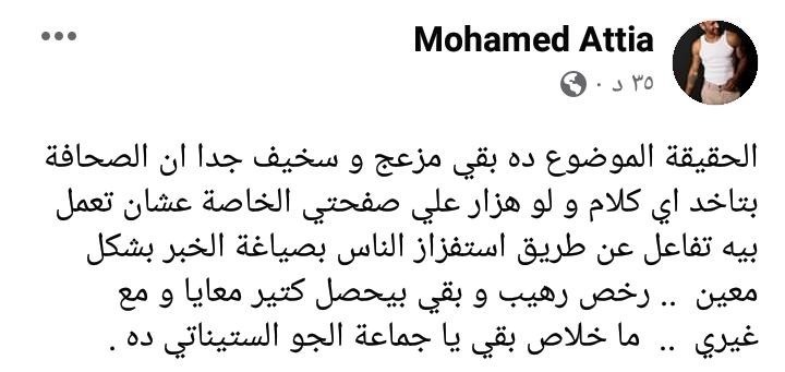 وكتب عطيه عبر حسابه بموقع التواصل الاجتماعي فيسبوك: الحقيقة الموضوع ده بقي مزعج و سخيف جدًا أن الصحافة بتاخد اي كلام و لو هزار علي صفحتي الخاصة عشان تعمل بيه تفاعل عن طريق استفزاز الناس بصياغة الخبر بشكل معين .
