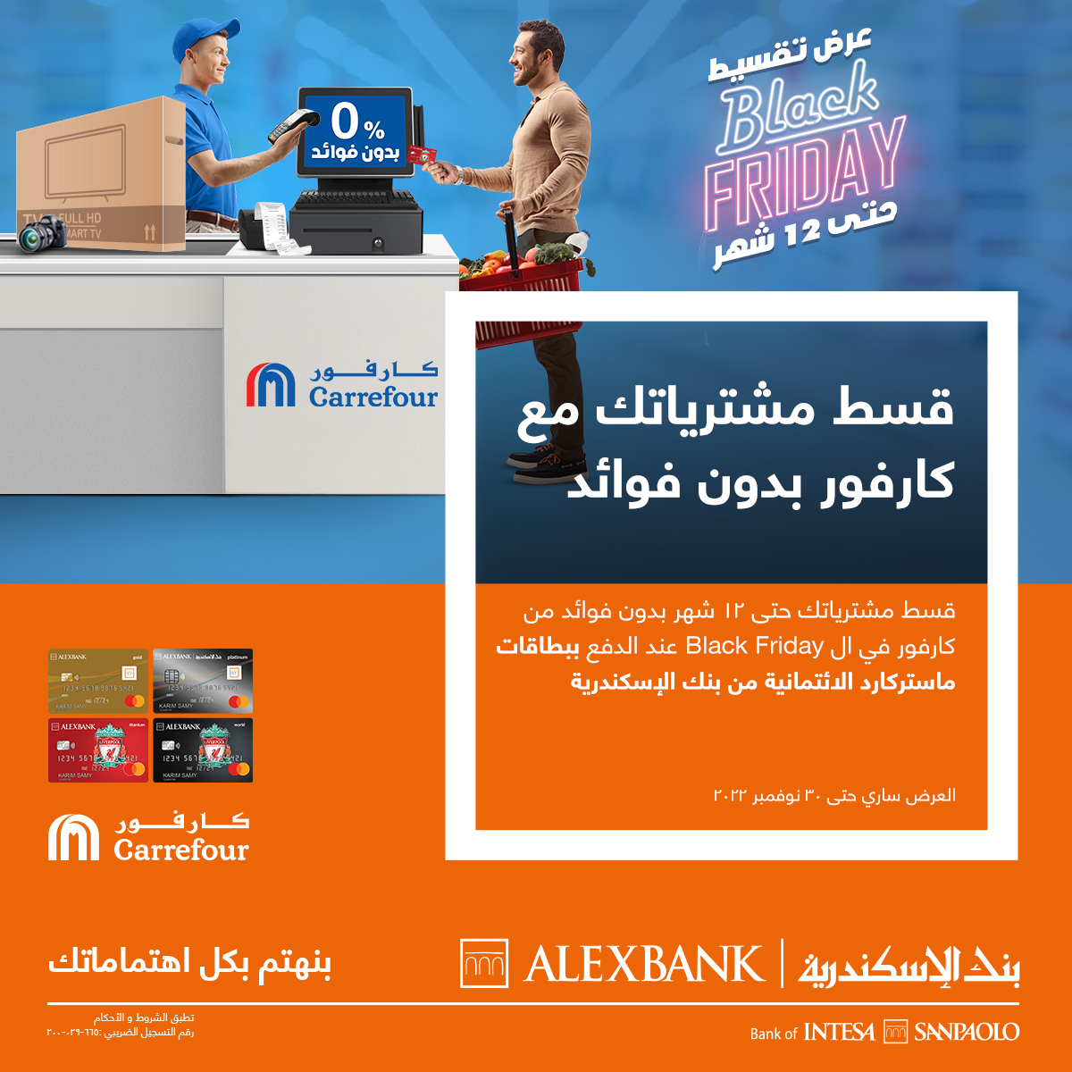 ونشر بنك الاسكندرية عبر صفحته الرسمية على موقع "فيسبوك"، : "قسط مشترياتك حتى 12 شهر بدون فوائد من كارفور عند الدفع ببطاقات ماستركارد الائتمانية من بنك الاسكندرية".