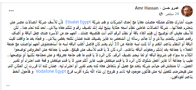 قال أحد عملاء اتصالات مصر عبر حسابه الشخصي على موقع "فيسبوك"،: "حبيت أشارك معاكم مشكله حصلت معايا مع إحدى الشركات وهى شركة Etisalat Egypt لأن للأسف شركة اتصالات مصر مش بتحترم عملائها".