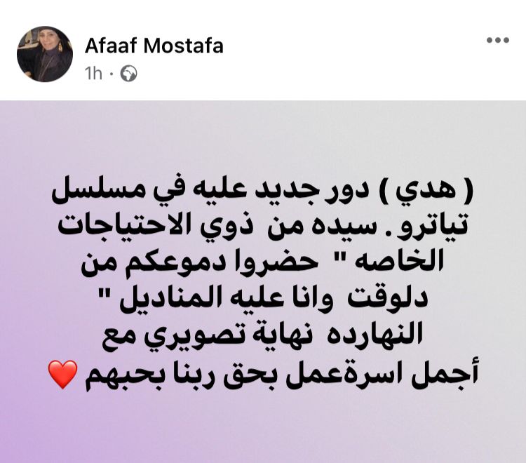 وكتبت عفاف مصطفى عبر فيسبوك: "هدي" دور جديد عليه في مسلسل تياترو.. سيدة من ذوي الاحتياجات الخاصه "حضروا دموعكم من دلوقت وانا عليه المناديل ".