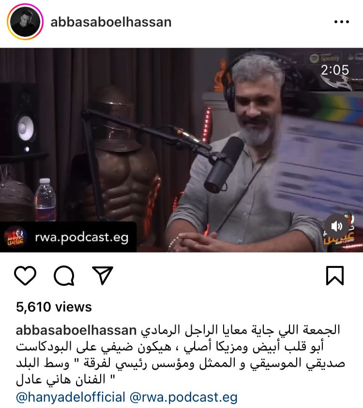 وعلق عباس على الفيديو: معايا الراجل اللي الرمادي أبو قلب أبيض ومزيكا أصلي، هيكون ضيفي في البودكاست، صديقي الموسيقي والممثل ومؤسس رئيسي لفرقة “وسط البلد” الفنان هاني عادل.
