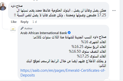 ونشر البنك العربى الافريقى عبر صفحته الرسمية على موقع "فيسبوك"،: "استثمر مع الشهادات الثلاثية من البنك العربي الافريقي الدولي بعائد ثابت تنافسي يصل إلى %17.25".