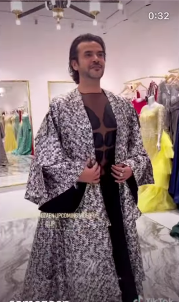 وظهر سامو زين داخل اتليه فساتين، مرتدية إحدى الفساتين التي تبينت من هيئتها إطلالة أنثوية، إذ ارتدي توب شفاف باللون الاسود وعليه كردجيان باللون الاسود في الابيض.