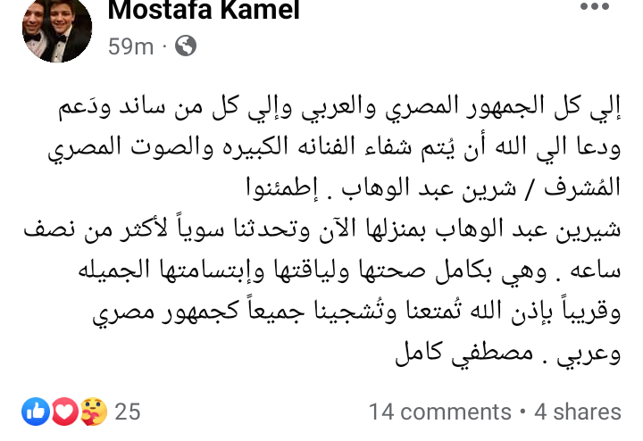 وجاء بيان مصطفى كامل عن المطربة شيرين عبد الوهاب، على النحو الآتي: إلي كل الجمهور المصري والعربي وإلي كل من ساند ودَعم ودعا الي الله أن يُتم شفاء الفنانه الكبيره والصوت المصري المُشرف / شرين عبد الوهاب، إطمئنوا.