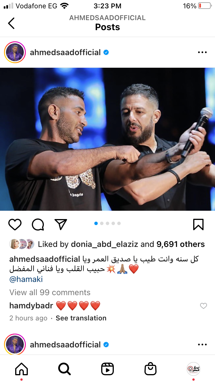 ونشر أحمد سعد مجموعة من الصور تجمعه بمحمد حماقي عبر انستجرام، وعلق: كل سنة وانت طيب يا صديق العمر، ويا حبيب القلب ويا فناني المفضل.