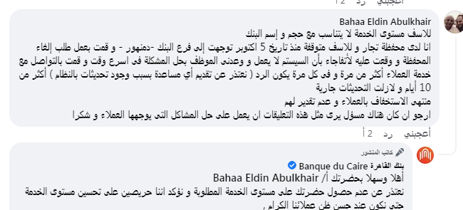 قال عميل بنك القاهرة في تعليق على صفحة المصرف الرسمية على موقع "فيسبوك"،: للأسف مستوى الخدمة لا يتناسب مع حجم واسم البنك".