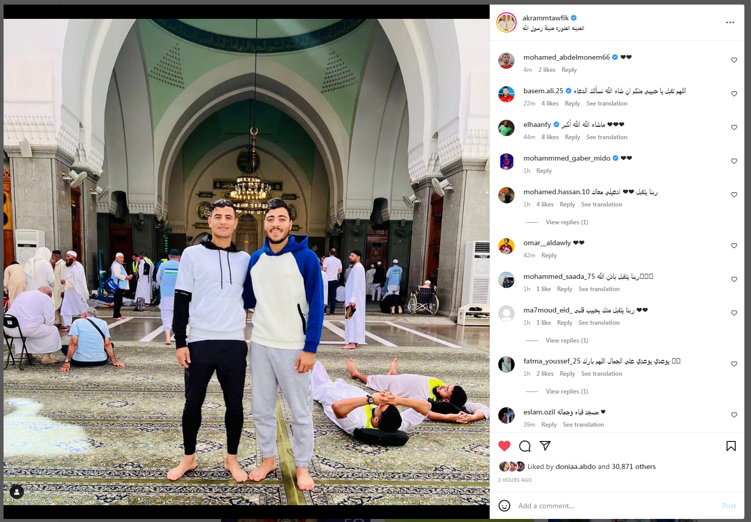 نشر أكرم توفيق، لاعب النادي الأهلي ، صورة تجمع بينه وبين شقيقه لاعب البنك الأهلي من داخل المسجد النبوي، عبر حسابه الشخصى على إنستجرام، واستغل الشقيقان فرصة توقف الدوري لأداء مناسك العمرة.