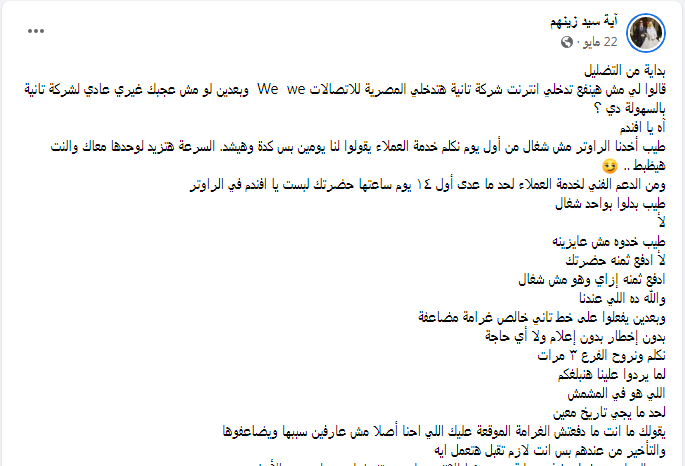 قالت أحدى عملاء المصرية للاتصالات we عبر صفحتها الشخصية على موقع "فيسبوك"،: "بداية من التضليل، قالوا لي مش هينفع تدخلي انترنت شركة تانية هتدخلي المصرية للاتصالات we وبعدين لو مش عجبك غيري عادي لشركة تانية بالسهولة دي؟".