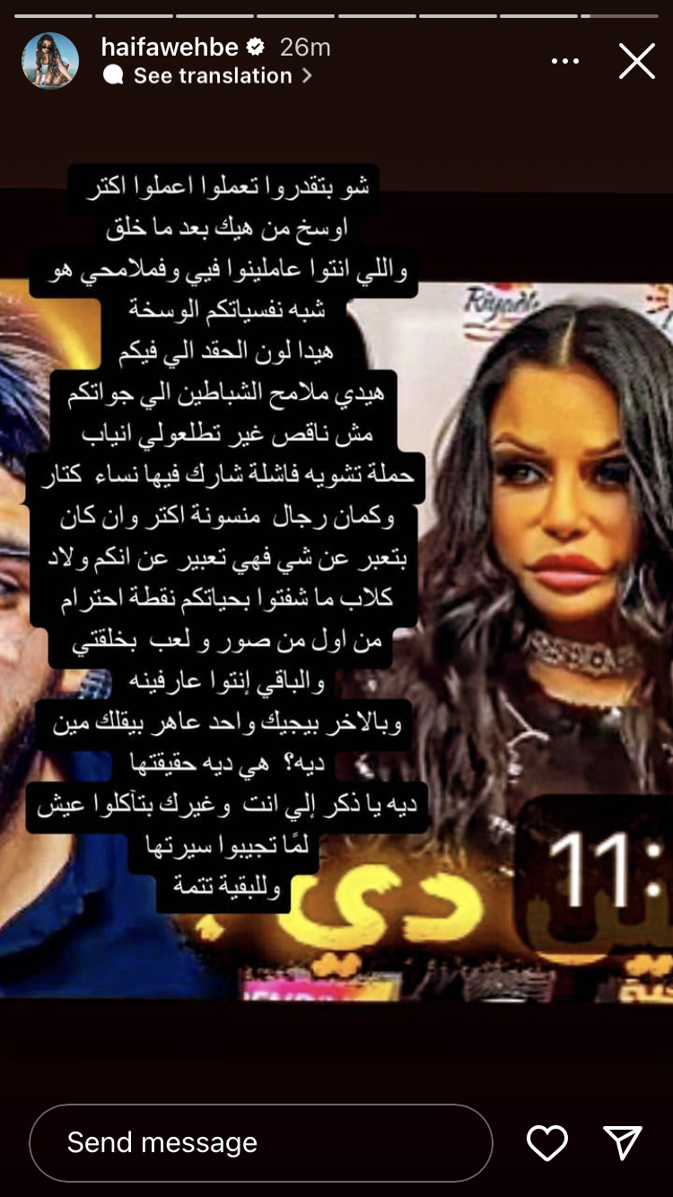 وكتبت هيفاء عبر خاصية ستوري، بانستجرام: شو بتقدروا تعلموا اعملوا اكتر اوسخ من هيك بعد ما خلق واللي انتوا عاملينوا فيي وفي ملامحي، هو شبه نفسياتكم الوسخة، هيدا لون الحقد اللي فيكم مش ناقص غير تطلعولي انياب.